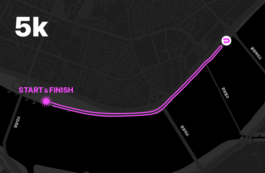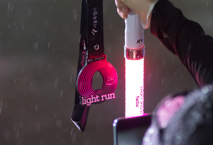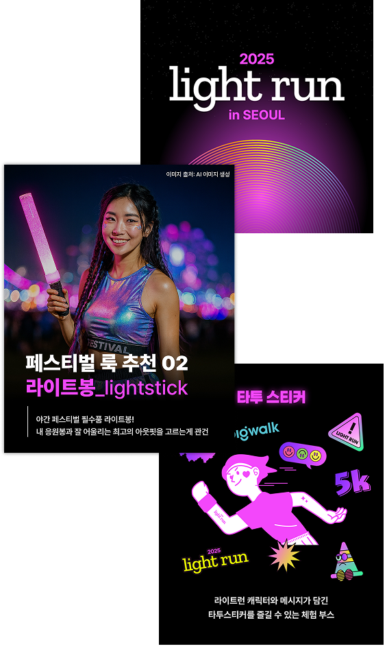올해 뚝섬 한강공원 일대에서 펼쳐진 5km 야간 코스는 참가자들이 라이트봉과 LED 암밴드를 착용해 스스로 빛이 되어 달리는 경험을 중심으로 설계했으며, 서울라이트 한강빛섬축제의 레이저 아트 조형물∙포토존 등과 연계해 야간 시각 몰입감을 극대화하는 동선을 구축했습니다 행사장에서는 래퍼 넉살의 축하무대, 기아∙스키피 땅콩버터 브랜드 부스, 이벤트 프로그램 등 다양한 참여형 콘텐츠가 운영되어, 러닝 전∙후 경험이 자연스럽게 이어지는 구조를 완성했습니다.