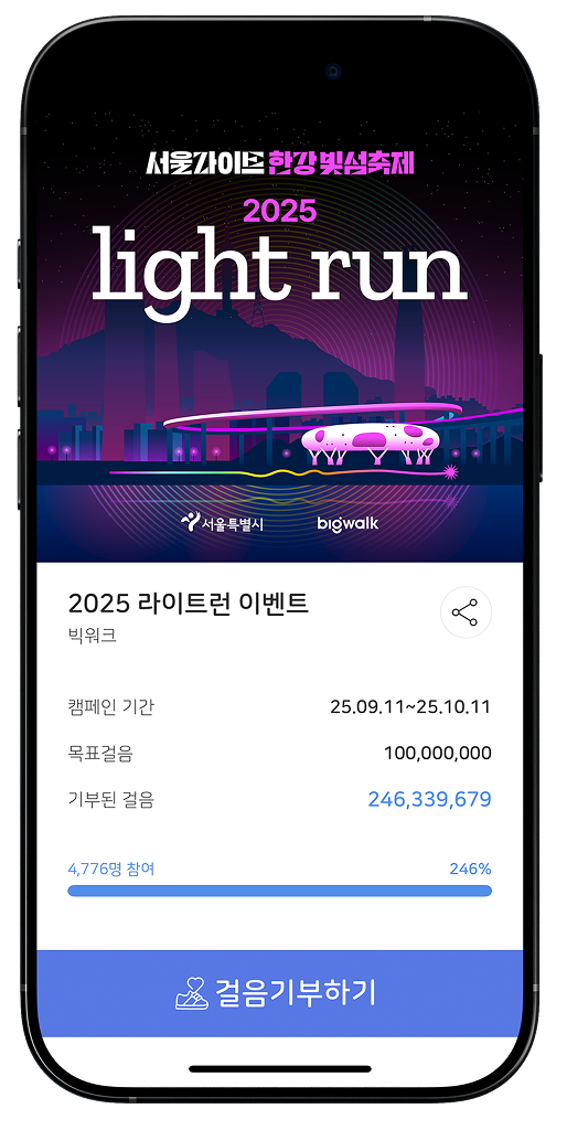 2025 라이트런은 빅워크가 보유한 자체 IP 기반의 야간 러닝 페스티벌로, 2023년부터 3년간 서울라이트 한강빛섬축제와 협력해 대표 프로그램으로 진행되고 있습니다.
