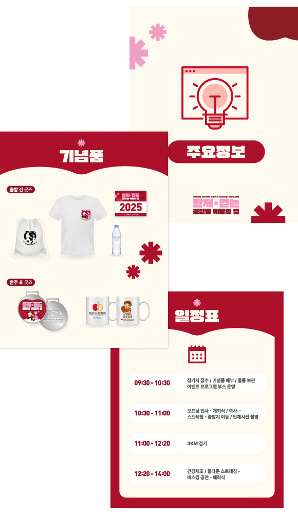 빅워크가 운영한 남산공원 백범광장 3km 걷기 캠페인입니다. 시민들이 일상 속에서 콩팥병 예방의 중요성을 이해하고 건강한 생활습관을 실천할 수 있도록, 걷기 프로그램, 메시지월, 상담 부스, 무대 공연, 이벤트 프로그램 등 다양한 체험 콘텐츠로 구성된 건강 캠페인형 페스티벌입니다.